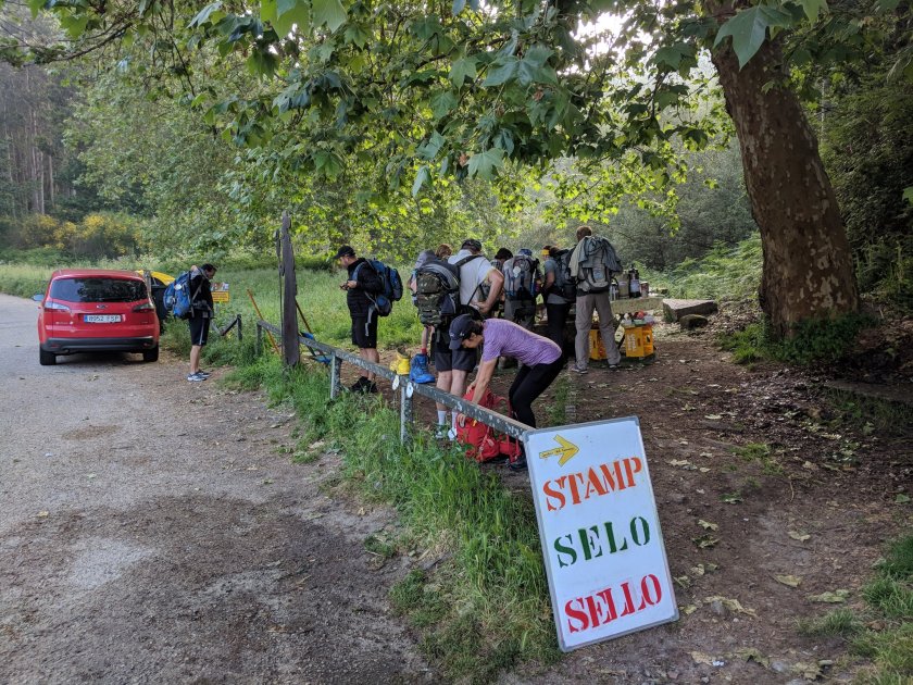As we came down the forested trail, we found this entrepreneur offering a stamp (‘sello’) as well as fruits, Camino shells/momentoes, snack bars. etc. I love it!